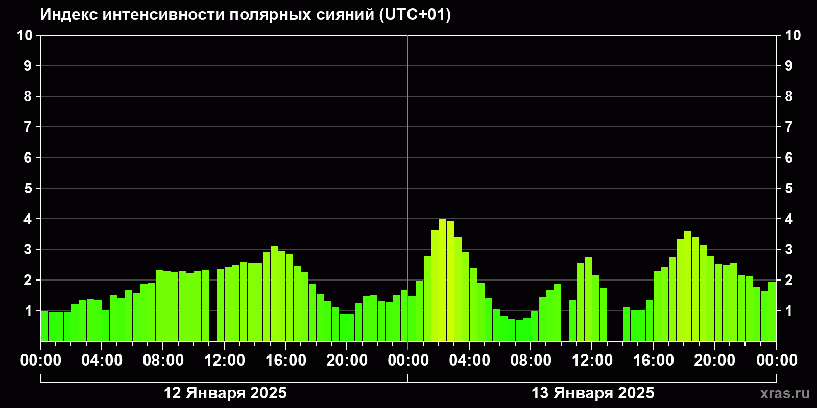 Изменения индекса интенсивности полярных сияний с 2025-01-12 по 2025-01-13 по местному времени