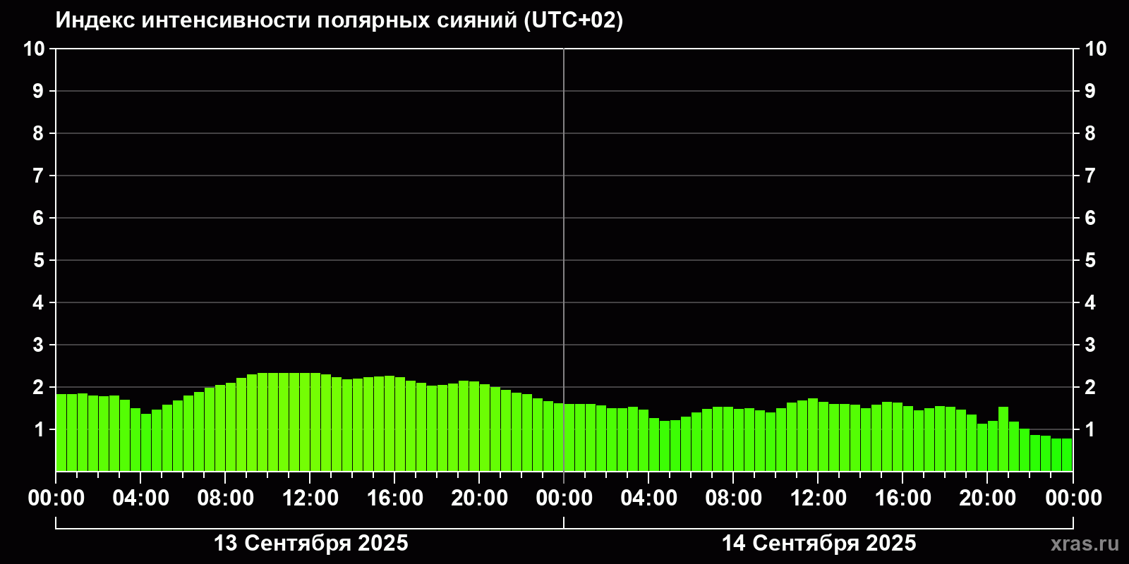Изменения индекса интенсивности полярных сияний с 2025-09-13 по 2025-09-14 по местному времени