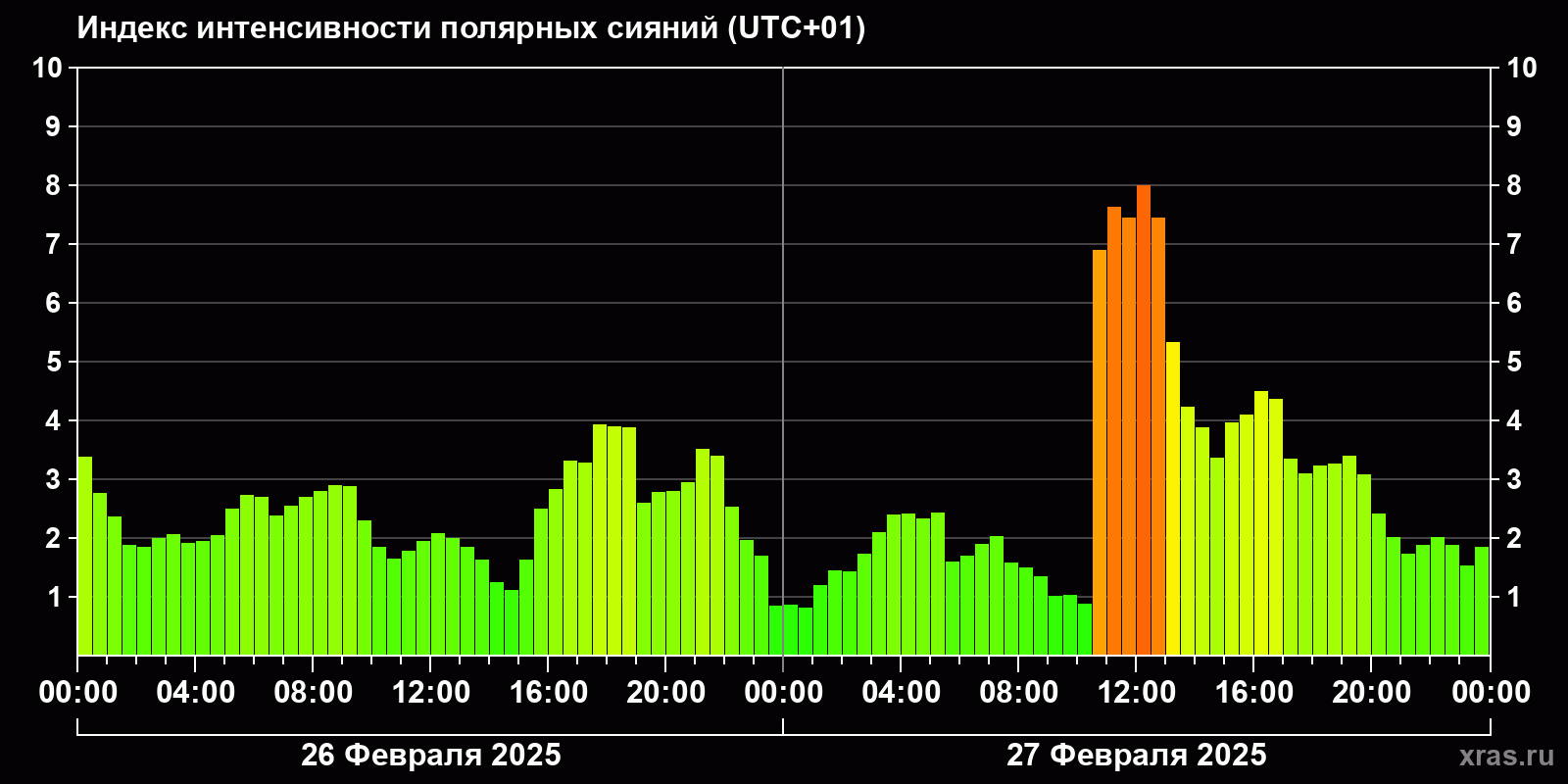 Изменения индекса интенсивности полярных сияний с 2025-02-26 по 2025-02-27 по местному времени
