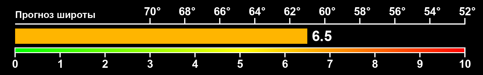 Индекс интенсивности полярных сияний и теоретически возможная широта наблюдений для ночного времени в восточном полушарии по состоянию на 2025-04-04 23:49 (конец дня) по местному времени