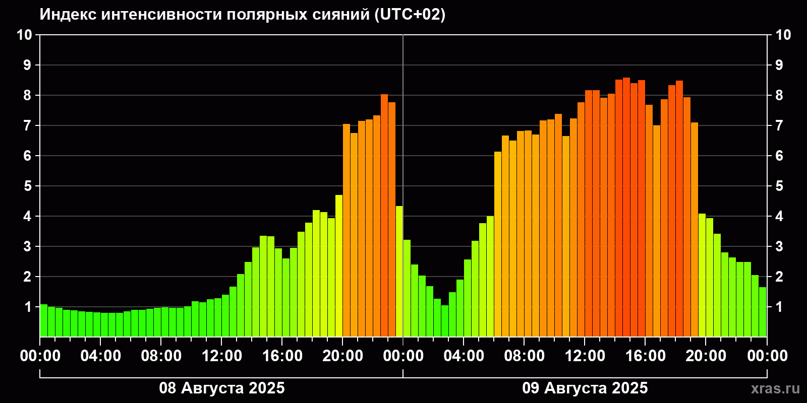 Изменения индекса интенсивности полярных сияний с 2025-08-08 по 2025-08-09 по местному времени