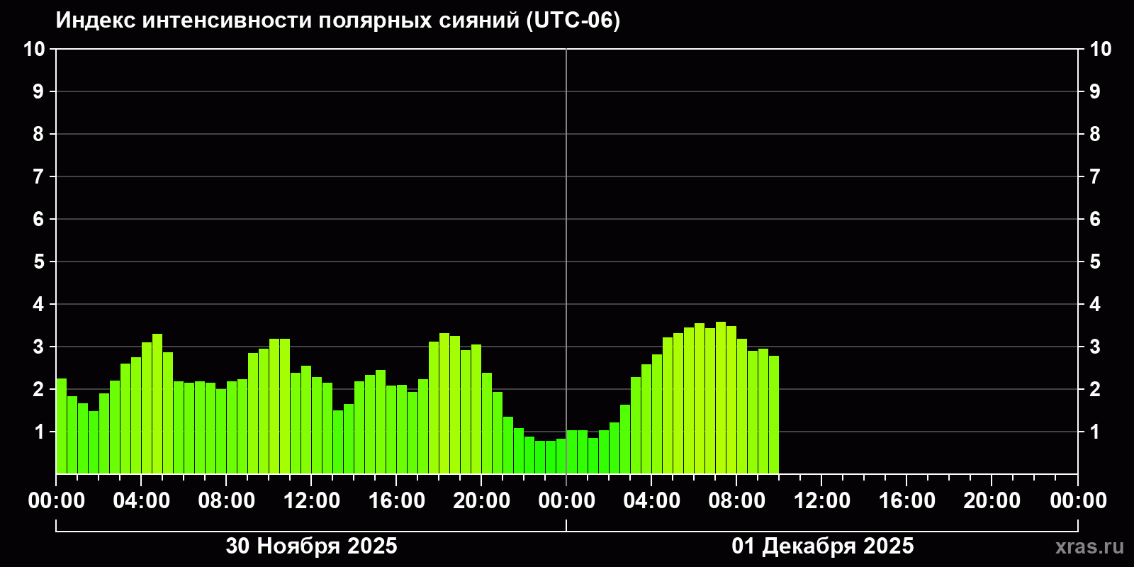Изменения индекса интенсивности полярных сияний с 2025-11-30 по 2025-12-01 по местному времени