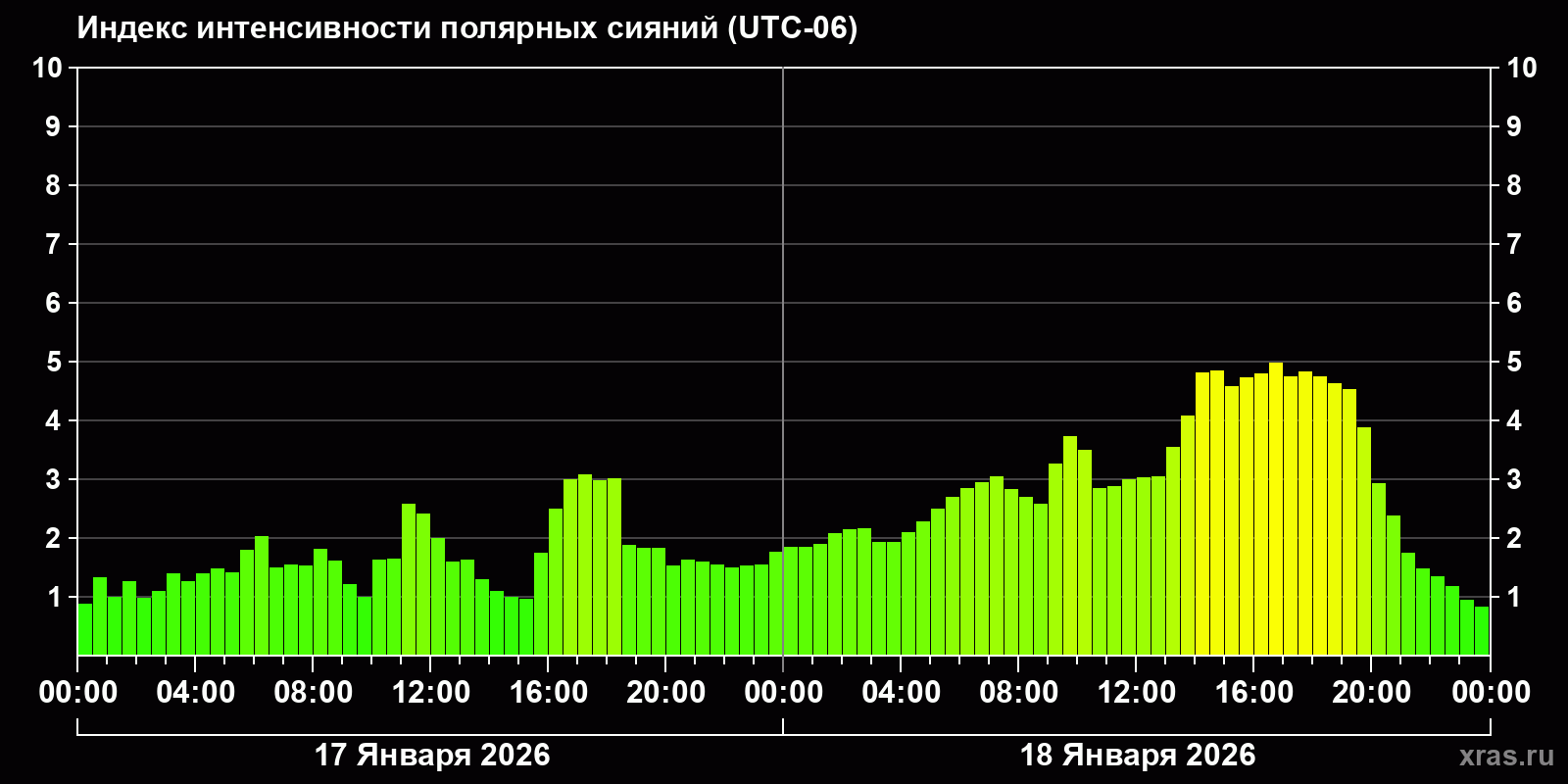 Изменения индекса интенсивности полярных сияний с 2026-01-17 по 2026-01-18 по местному времени