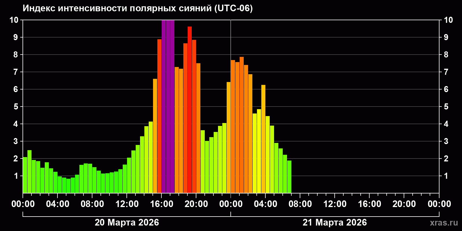 Изменения индекса интенсивности полярных сияний с 2026-03-20 по 2026-03-21 по местному времени