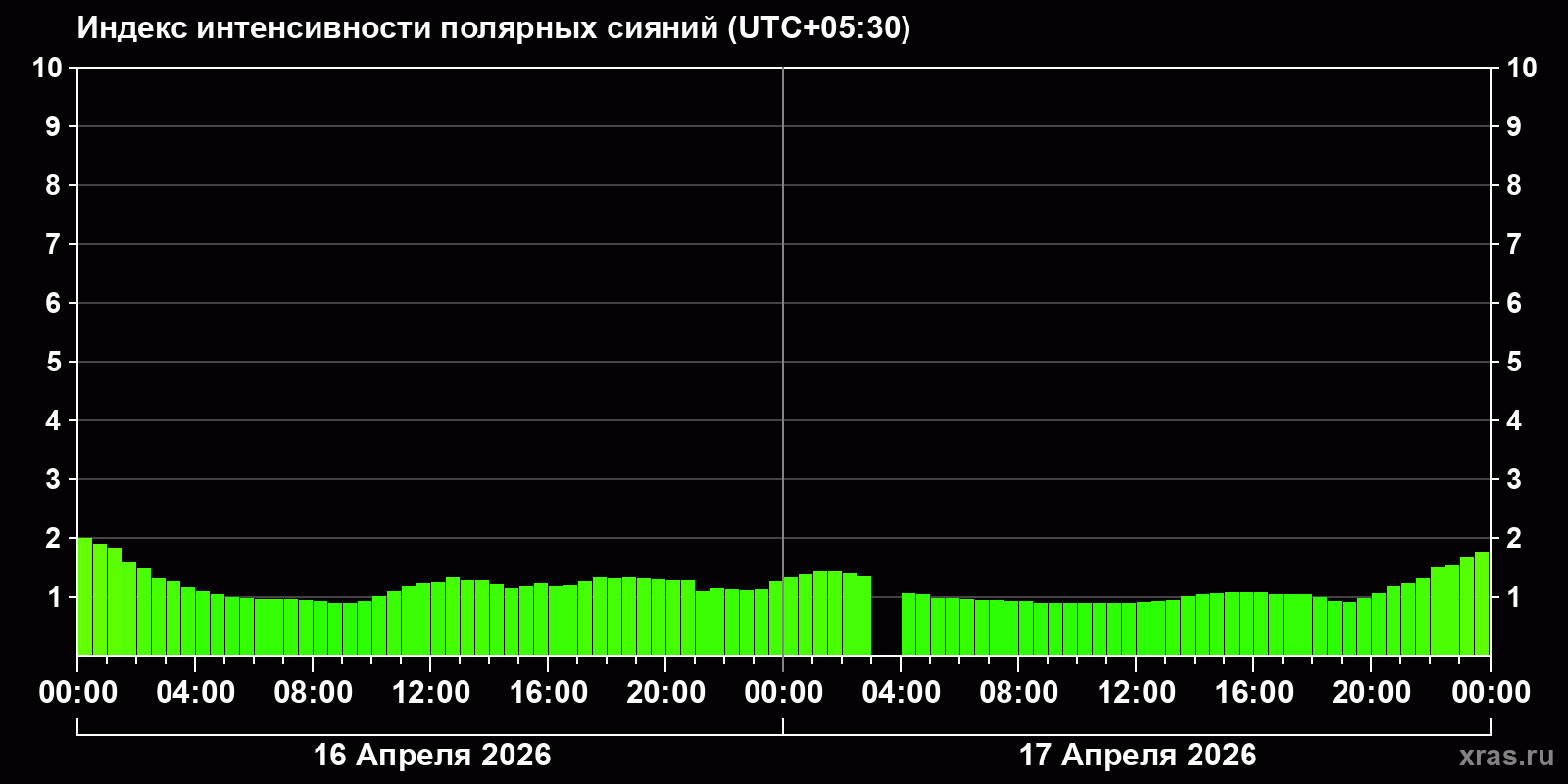 Изменения индекса интенсивности полярных сияний с 2026-04-16 по 2026-04-17 по местному времени