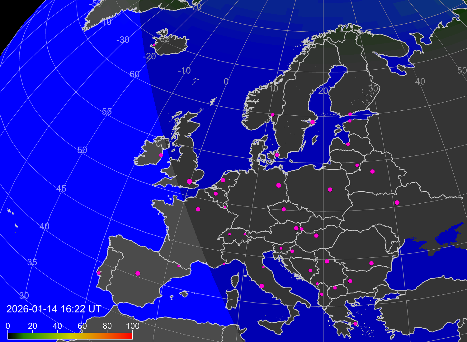 Индекс интенсивности полярных сияний и теоретически возможная широта наблюдений для ночного времени в восточном полушарии