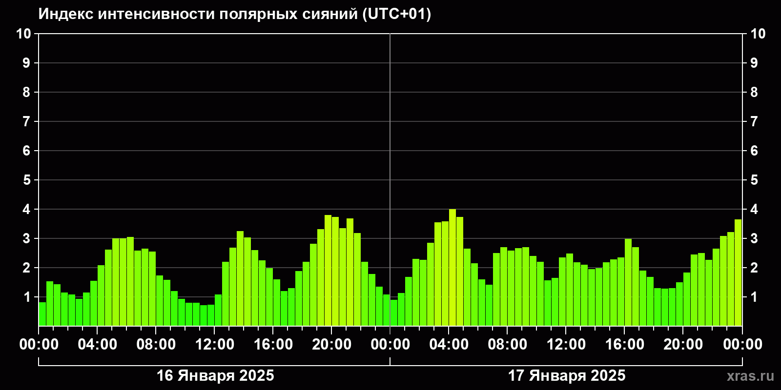 Изменения индекса интенсивности полярных сияний с 2025-01-16 по 2025-01-17 по местному времени