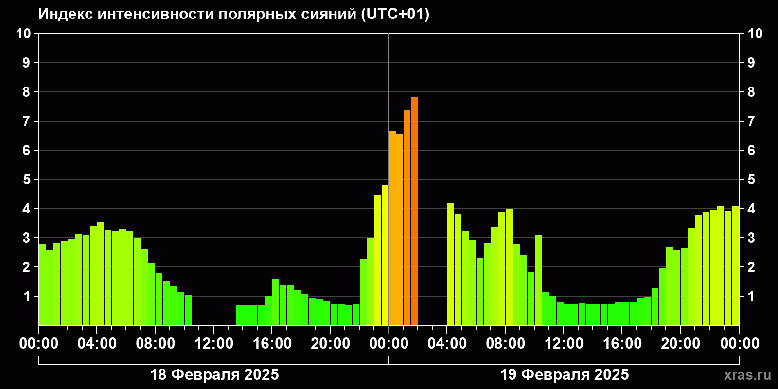 Изменения индекса интенсивности полярных сияний с 2025-02-18 по 2025-02-19 по местному времени