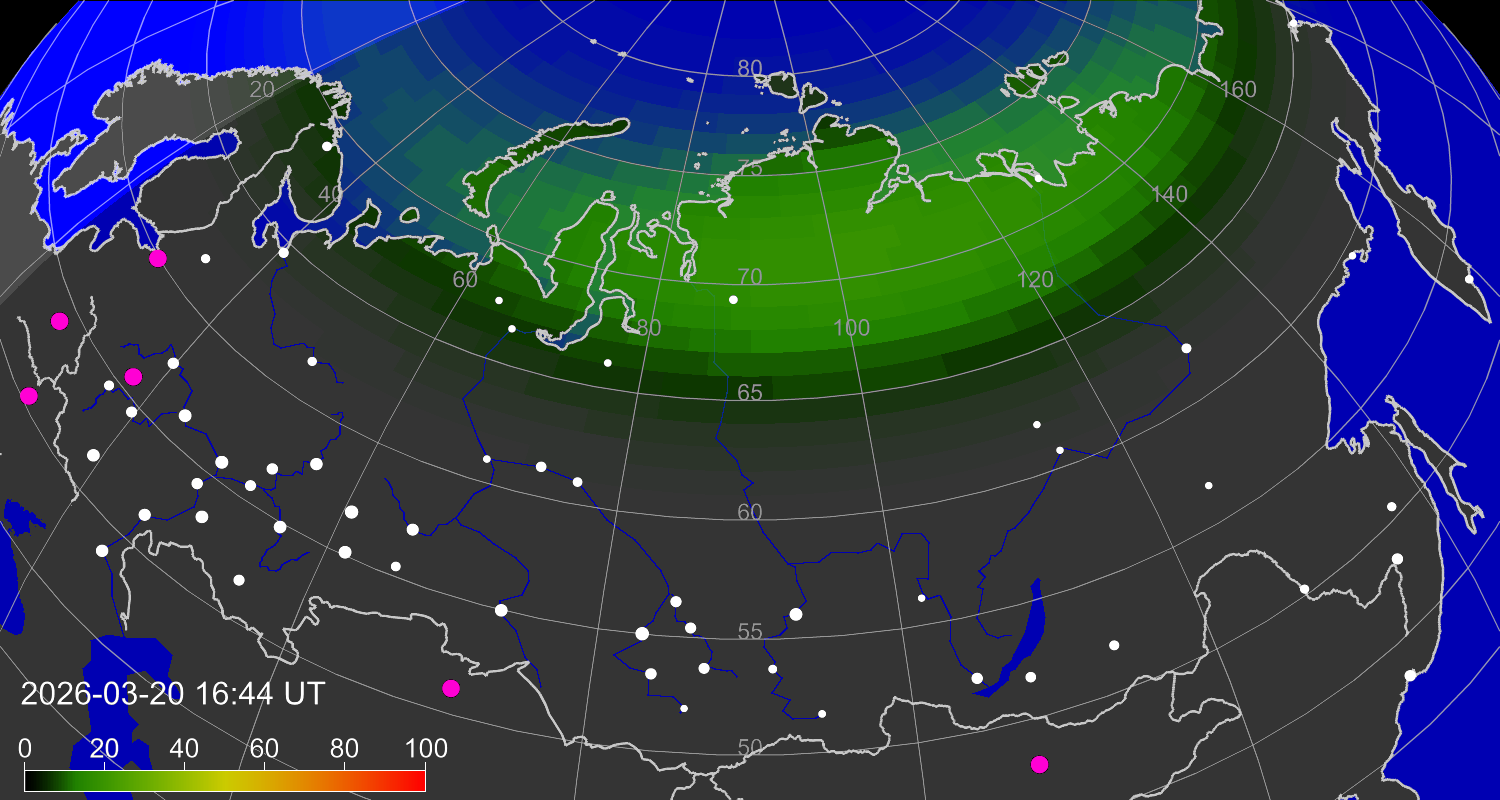 Индекс интенсивности полярных сияний и теоретически возможная широта наблюдений для ночного времени в восточном полушарии