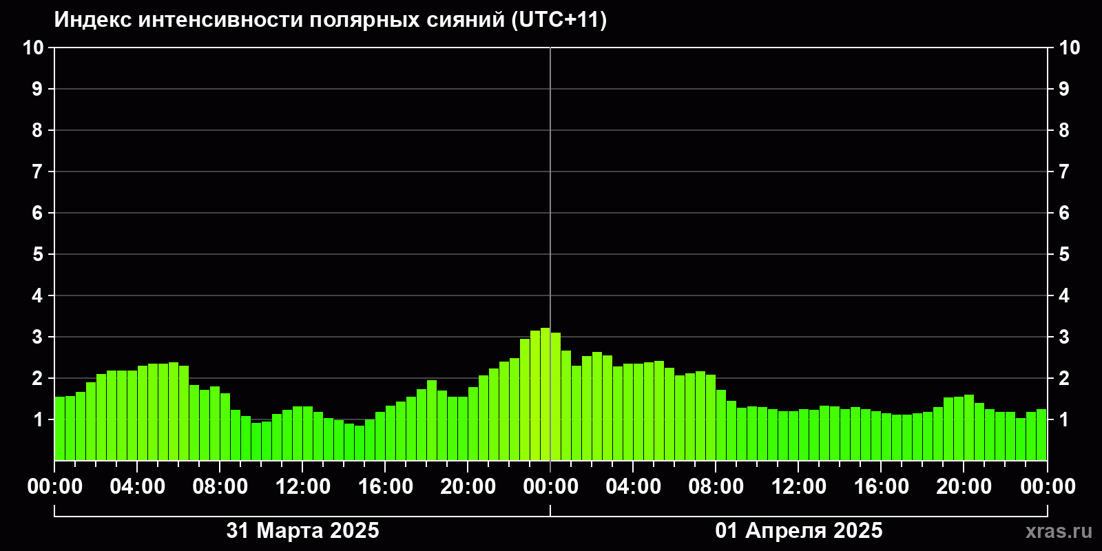 Изменения индекса интенсивности полярных сияний с 2025-03-31 по 2025-04-01 по местному времени