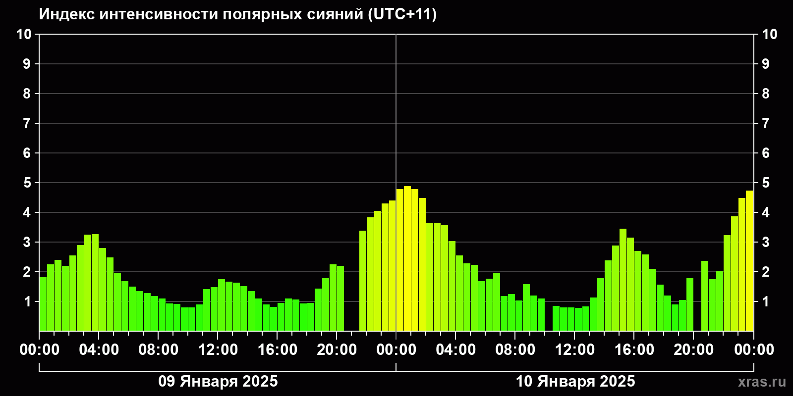 Изменения индекса интенсивности полярных сияний с 2025-01-09 по 2025-01-10 по местному времени