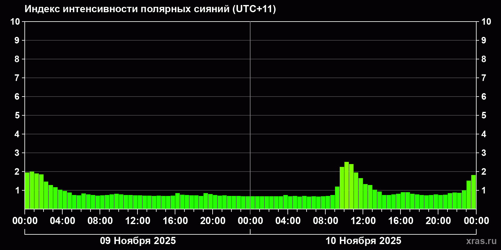 Изменения индекса интенсивности полярных сияний с 2025-11-09 по 2025-11-10 по местному времени
