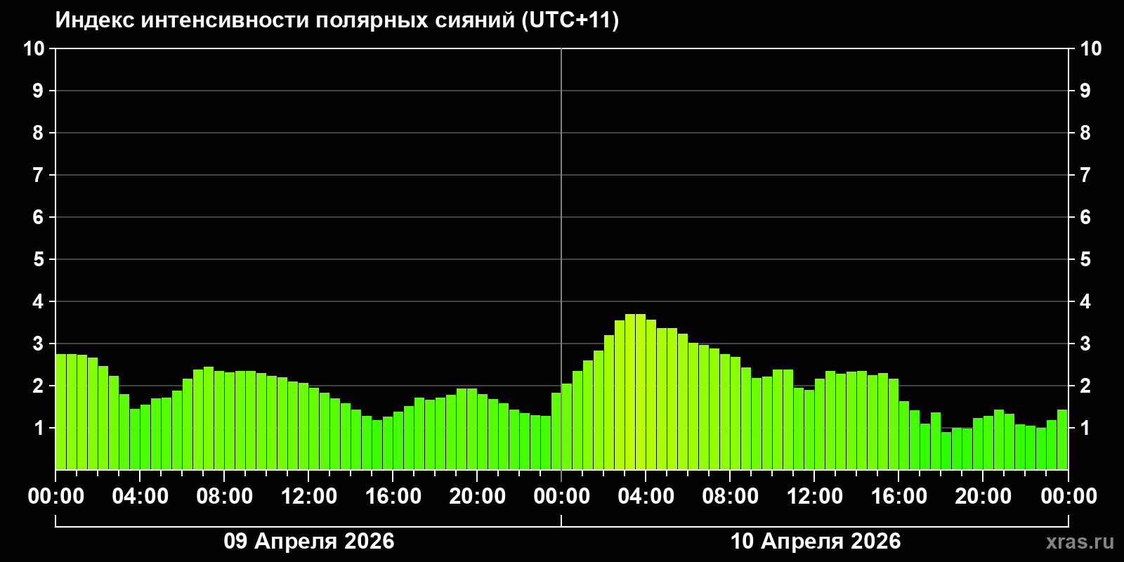 Изменения индекса интенсивности полярных сияний с 2026-04-09 по 2026-04-10 по местному времени