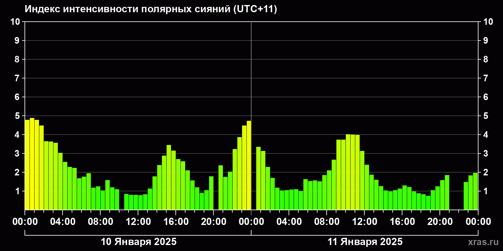 Изменения индекса интенсивности полярных сияний с 2025-01-10 по 2025-01-11 по местному времени