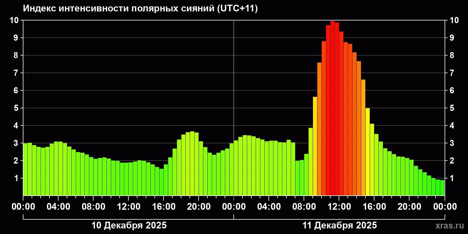 Изменения индекса интенсивности полярных сияний с 2025-12-10 по 2025-12-11 по местному времени