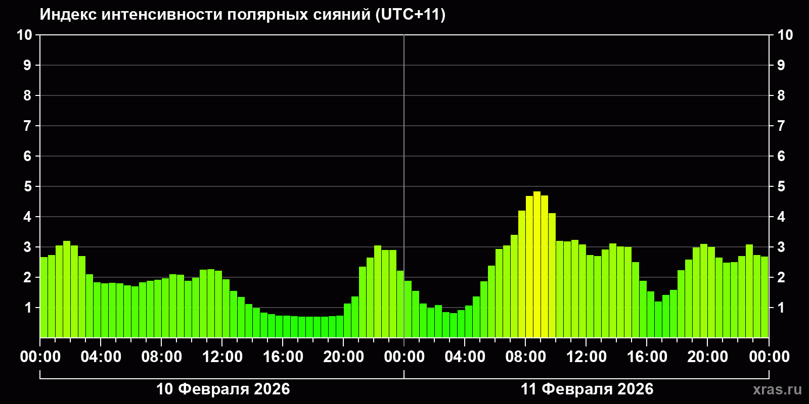 Изменения индекса интенсивности полярных сияний с 2026-02-10 по 2026-02-11 по местному времени