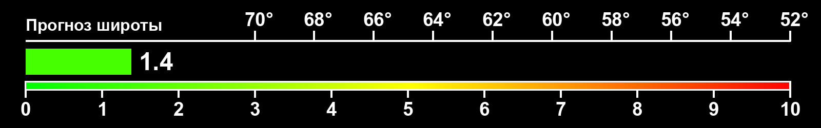 Индекс интенсивности полярных сияний и теоретически возможная широта наблюдений для ночного времени в восточном полушарии по состоянию на 2026-03-11 23:44 (конец дня) по местному времени