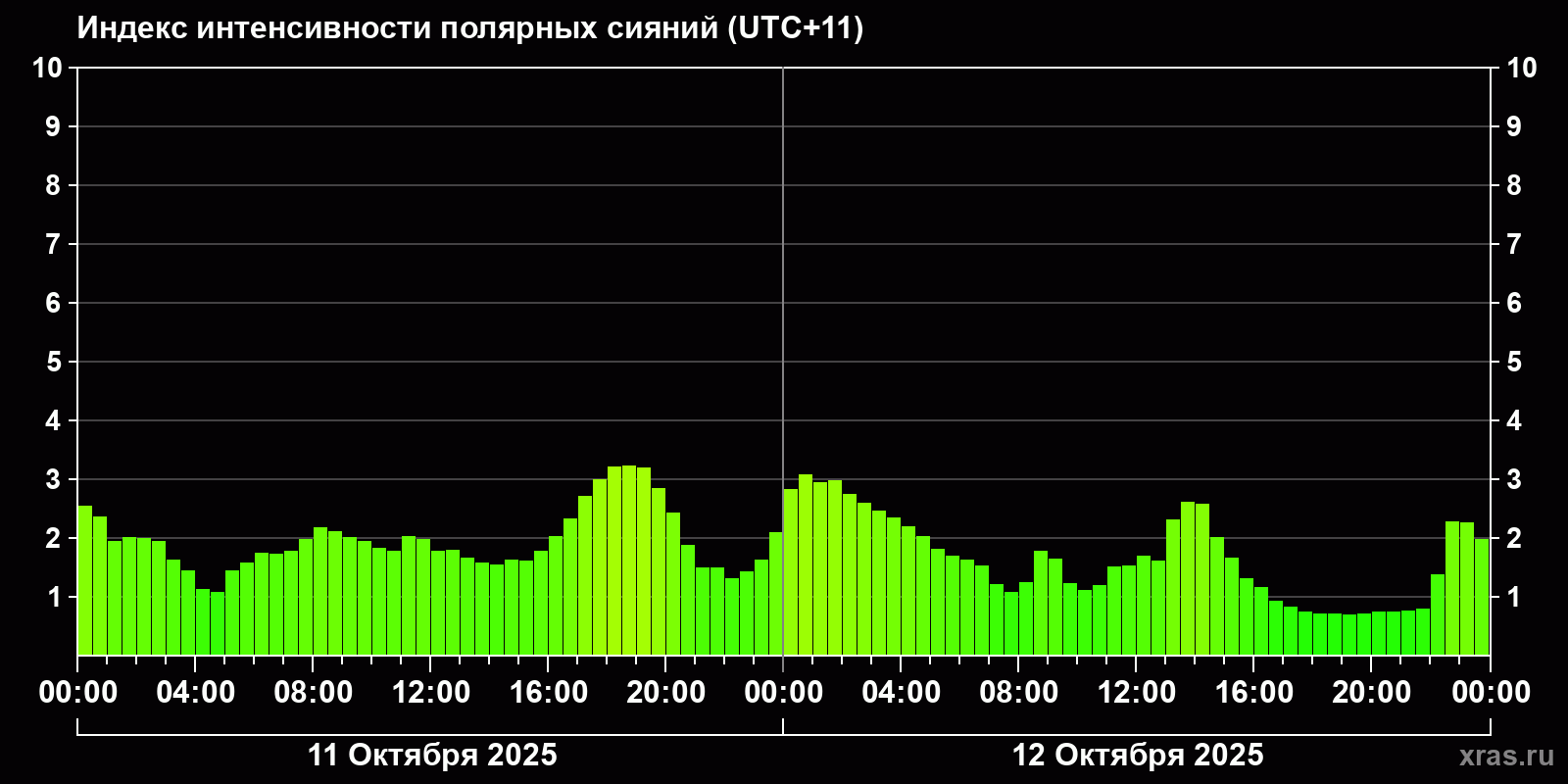 Изменения индекса интенсивности полярных сияний с 2025-10-11 по 2025-10-12 по местному времени