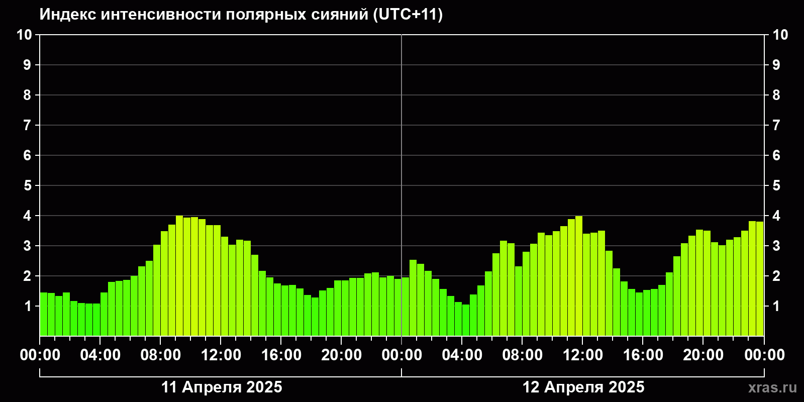 Изменения индекса интенсивности полярных сияний с 2025-04-11 по 2025-04-12 по местному времени