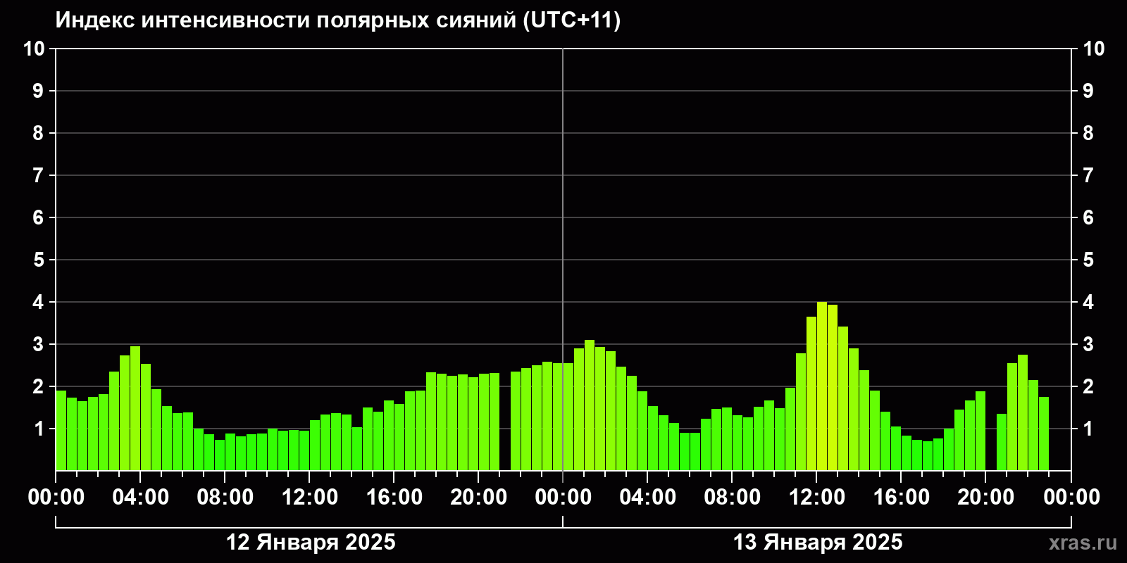 Изменения индекса интенсивности полярных сияний с 2025-01-12 по 2025-01-13 по местному времени