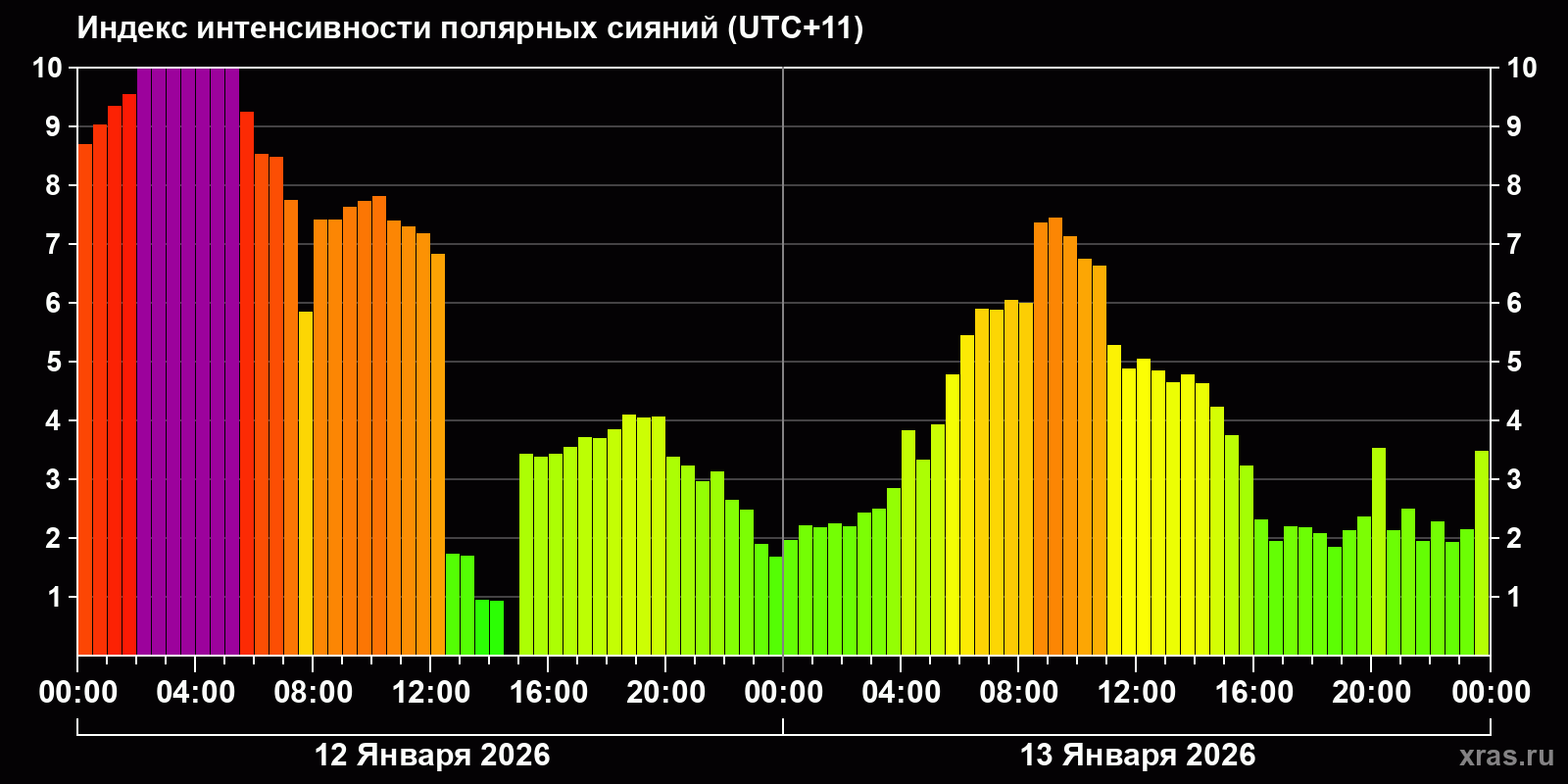 Изменения индекса интенсивности полярных сияний с 2026-01-12 по 2026-01-13 по местному времени