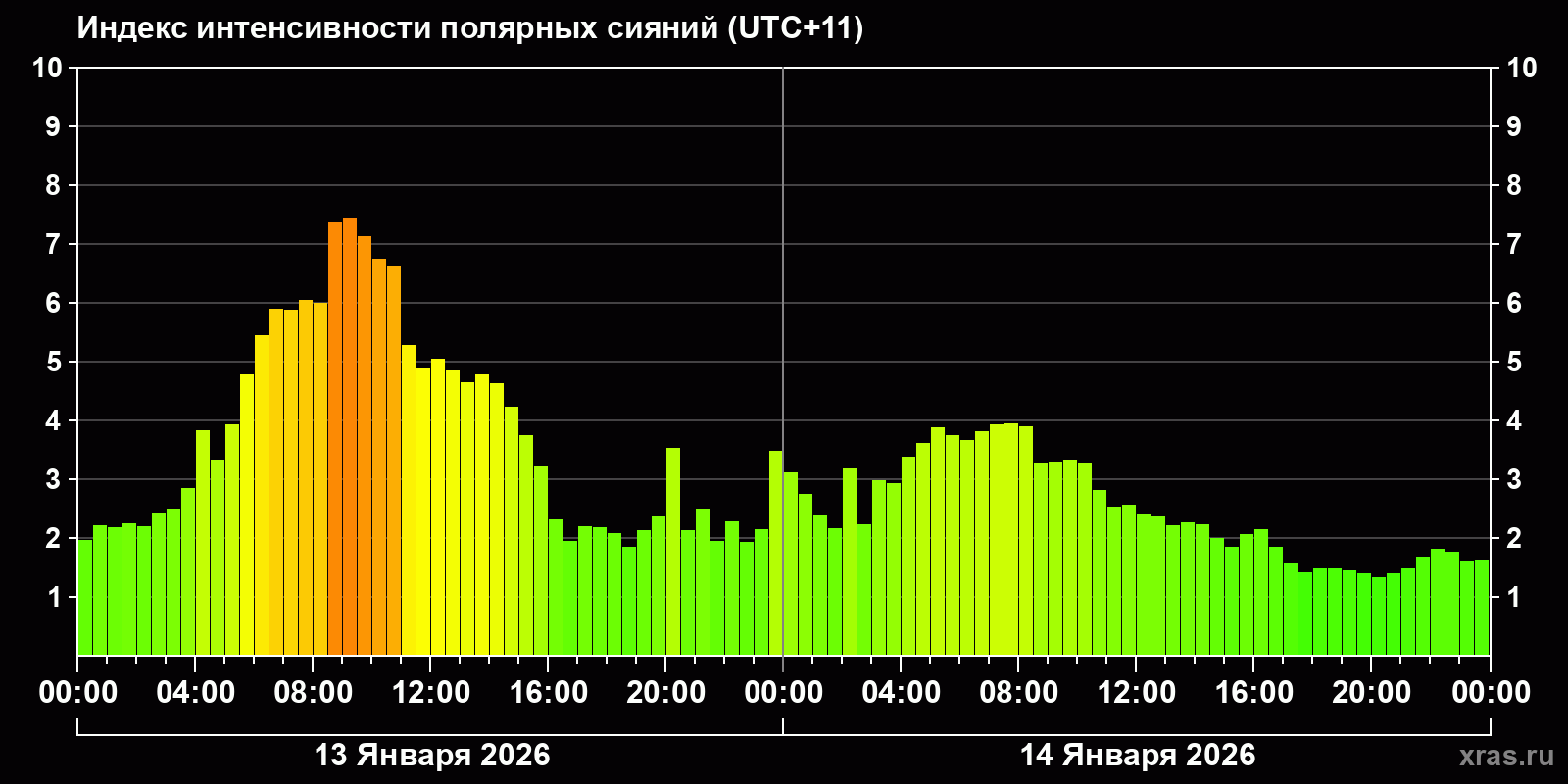 Изменения индекса интенсивности полярных сияний с 2026-01-13 по 2026-01-14 по местному времени
