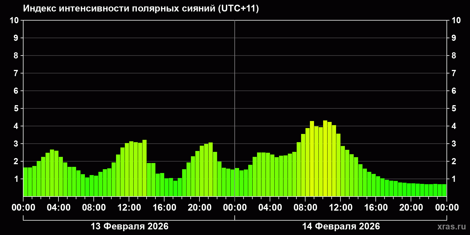 Изменения индекса интенсивности полярных сияний с 2026-02-13 по 2026-02-14 по местному времени
