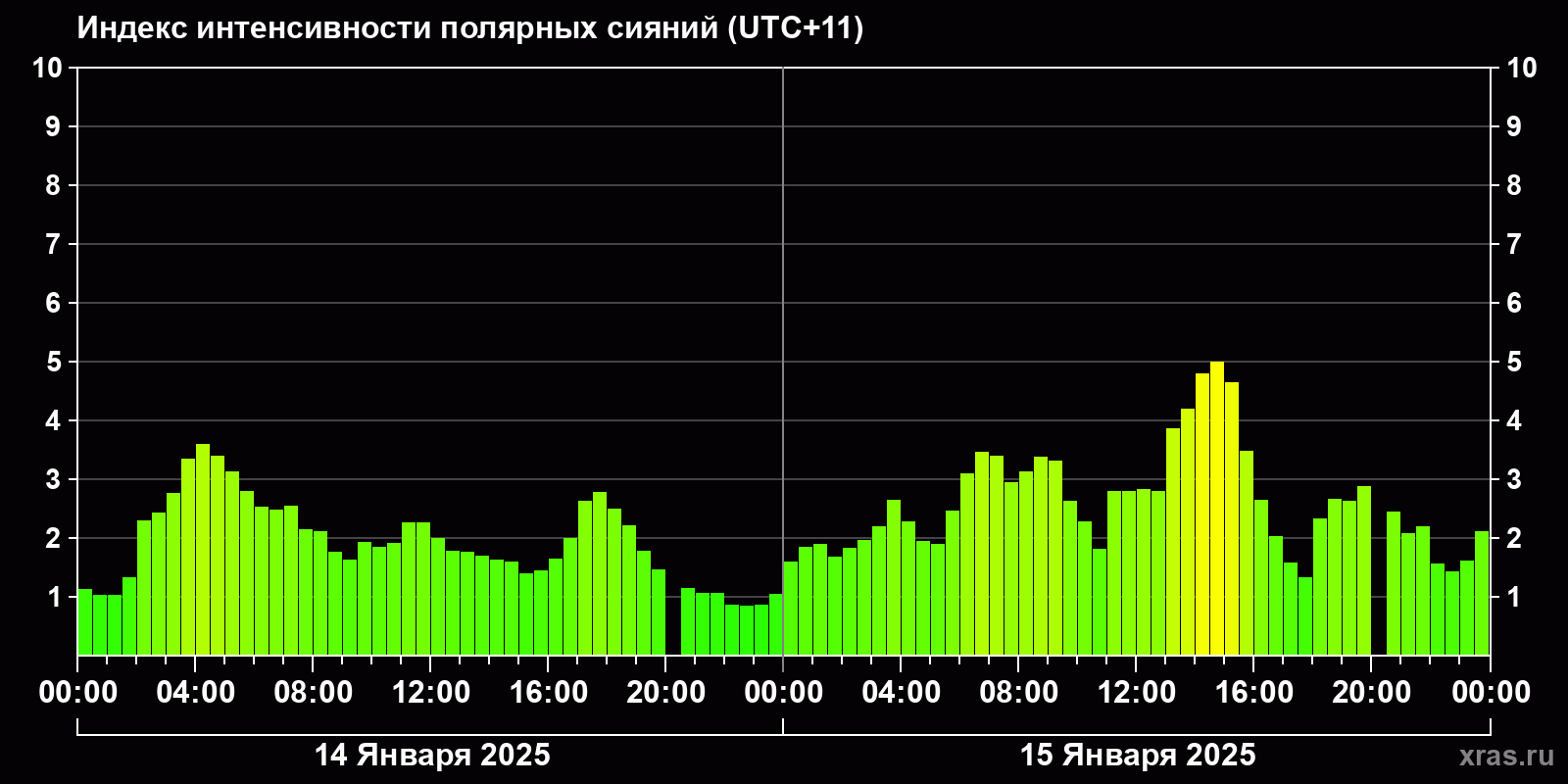Изменения индекса интенсивности полярных сияний с 2025-01-14 по 2025-01-15 по местному времени