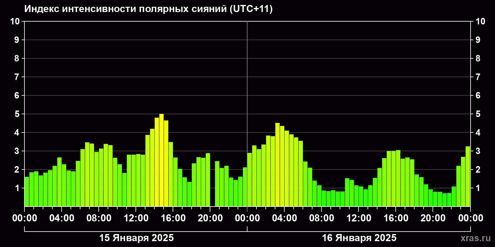 Изменения индекса интенсивности полярных сияний с 2025-01-15 по 2025-01-16 по местному времени