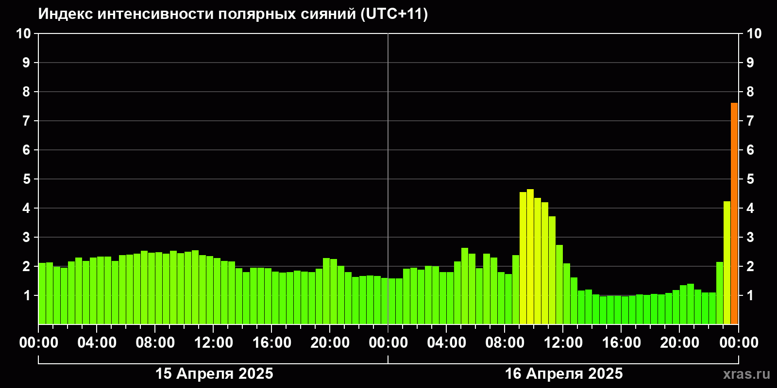 Изменения индекса интенсивности полярных сияний с 2025-04-15 по 2025-04-16 по местному времени