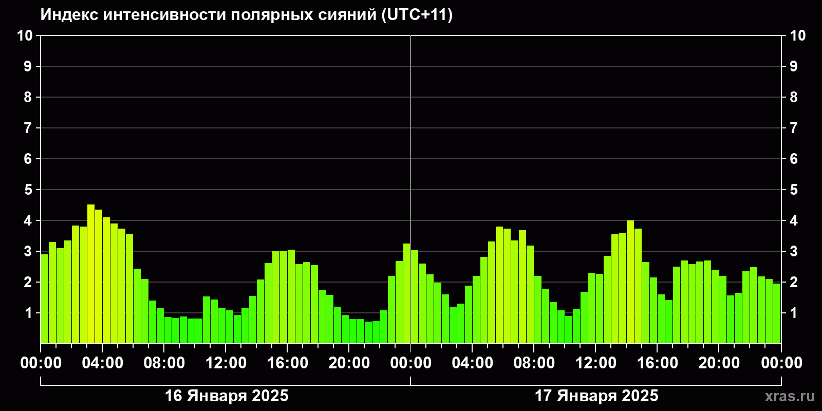 Изменения индекса интенсивности полярных сияний с 2025-01-16 по 2025-01-17 по местному времени