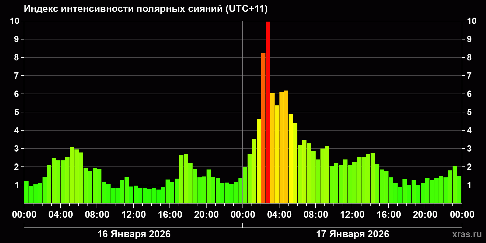 Изменения индекса интенсивности полярных сияний с 2026-01-16 по 2026-01-17 по местному времени