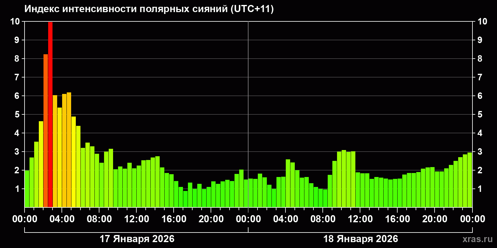 Изменения индекса интенсивности полярных сияний с 2026-01-17 по 2026-01-18 по местному времени