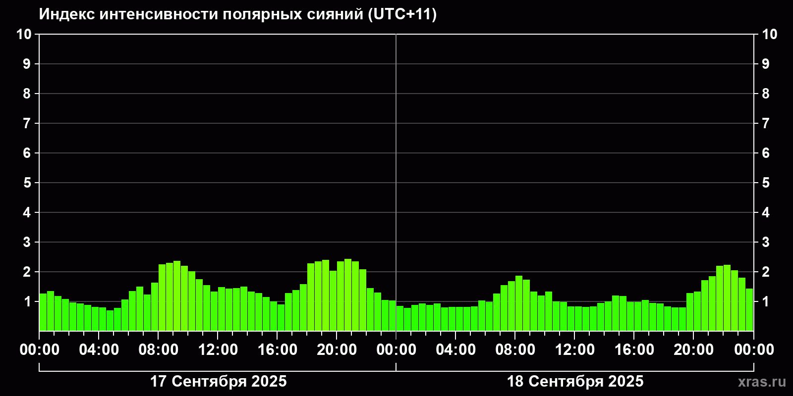 Изменения индекса интенсивности полярных сияний с 2025-09-17 по 2025-09-18 по местному времени