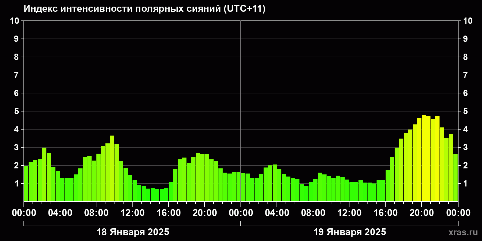 Изменения индекса интенсивности полярных сияний с 2025-01-18 по 2025-01-19 по местному времени