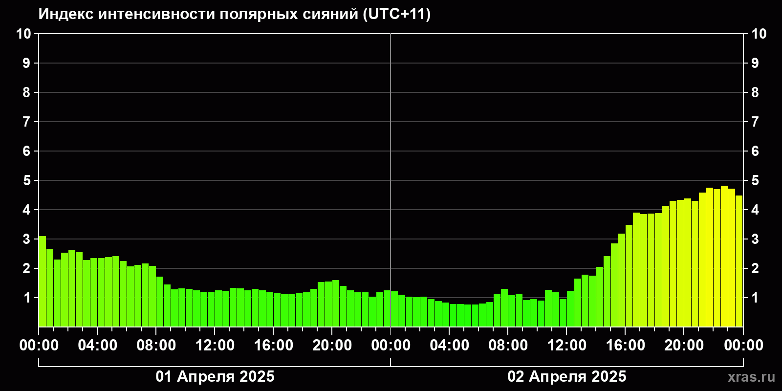 Изменения индекса интенсивности полярных сияний с 2025-04-01 по 2025-04-02 по местному времени