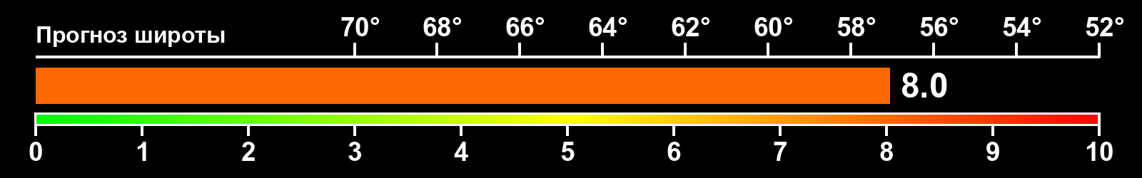 Индекс интенсивности полярных сияний и теоретически возможная широта наблюдений для ночного времени в восточном полушарии по состоянию на 2026-04-02 23:46 (конец дня) по местному времени