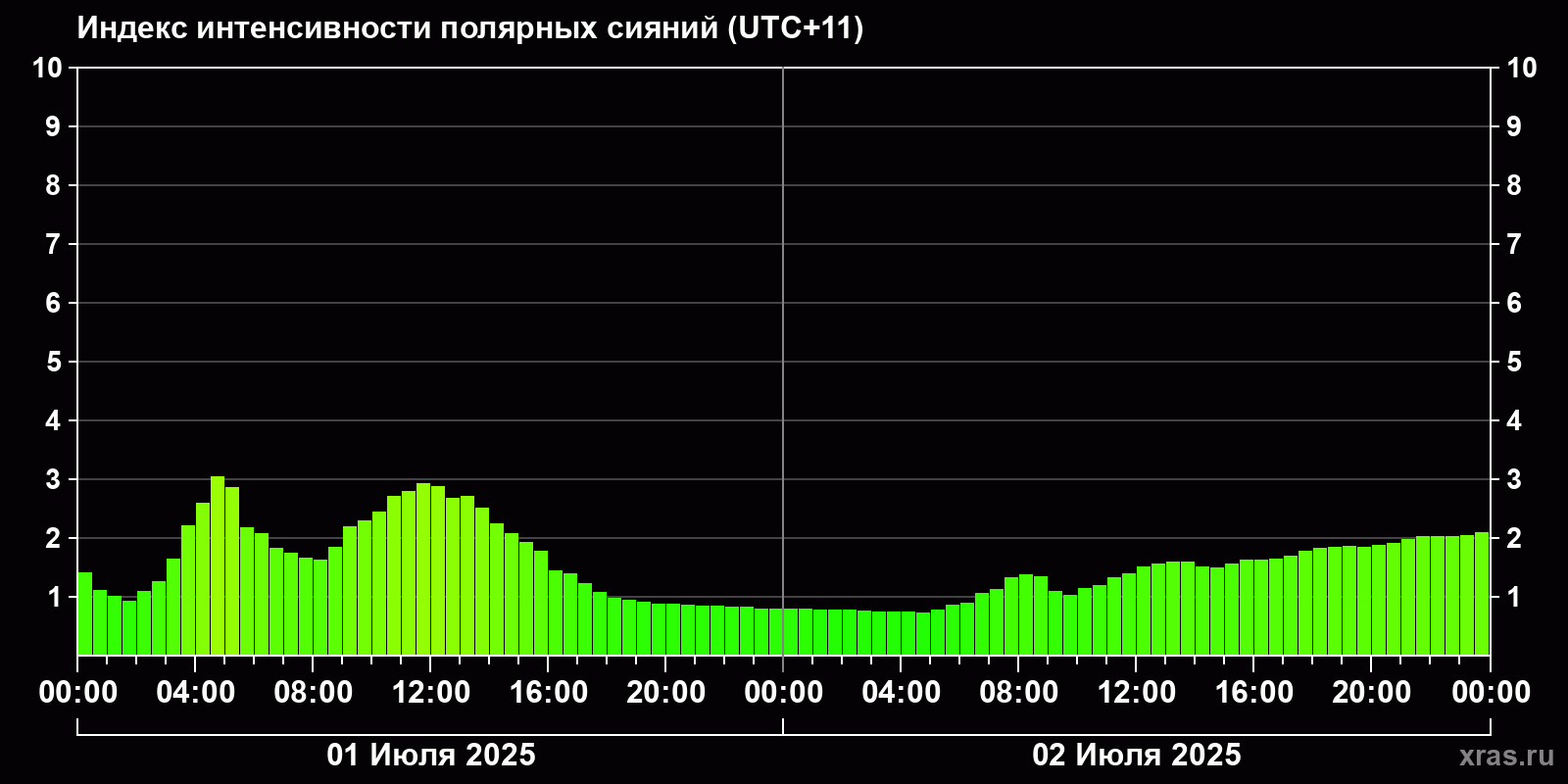 Изменения индекса интенсивности полярных сияний с 2025-07-01 по 2025-07-02 по местному времени