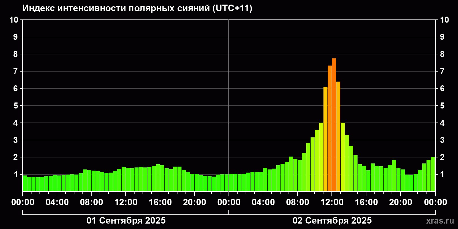 Изменения индекса интенсивности полярных сияний с 2025-09-01 по 2025-09-02 по местному времени