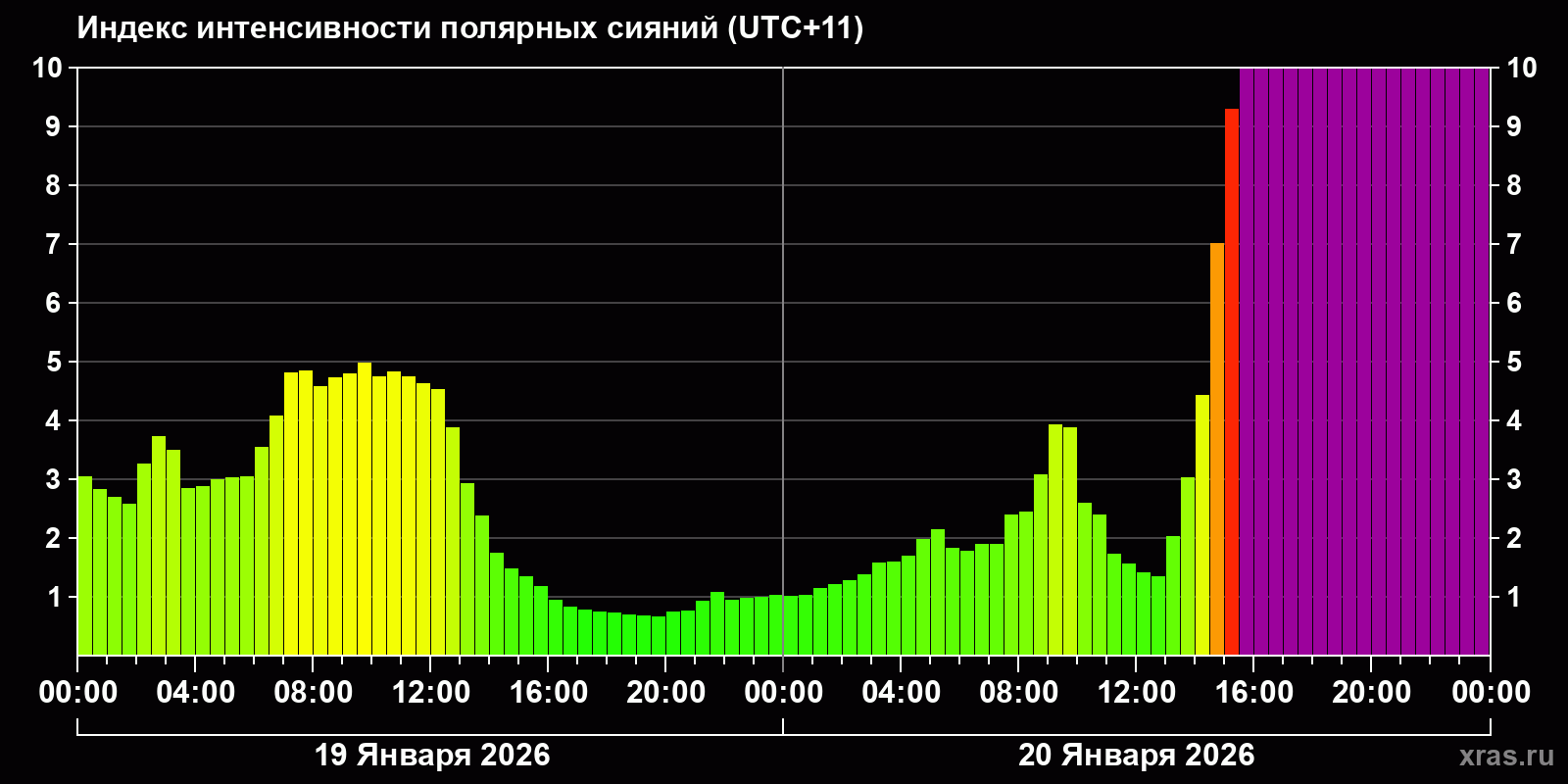 Изменения индекса интенсивности полярных сияний с 2026-01-19 по 2026-01-20 по местному времени