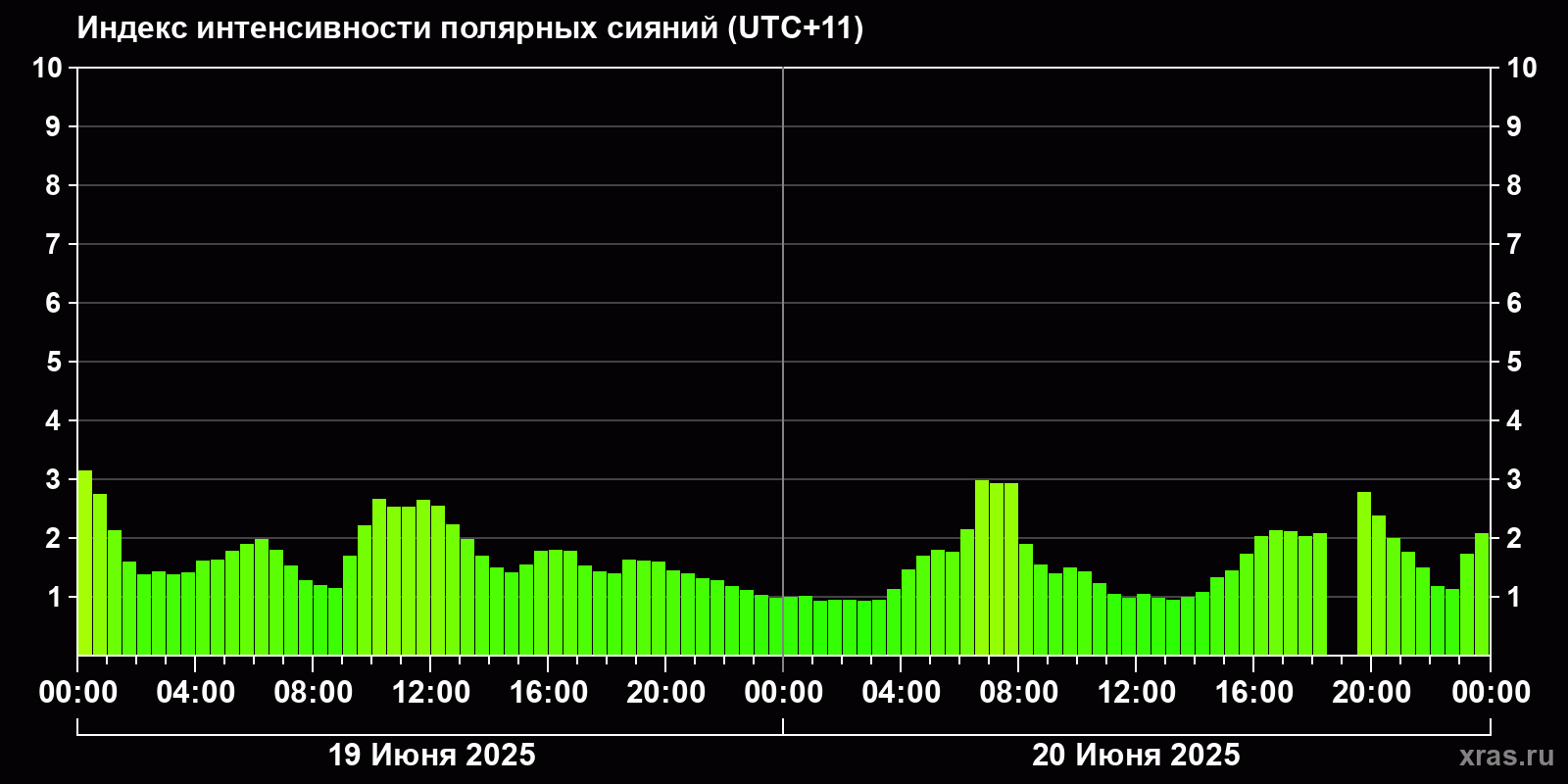 Изменения индекса интенсивности полярных сияний с 2025-06-19 по 2025-06-20 по местному времени