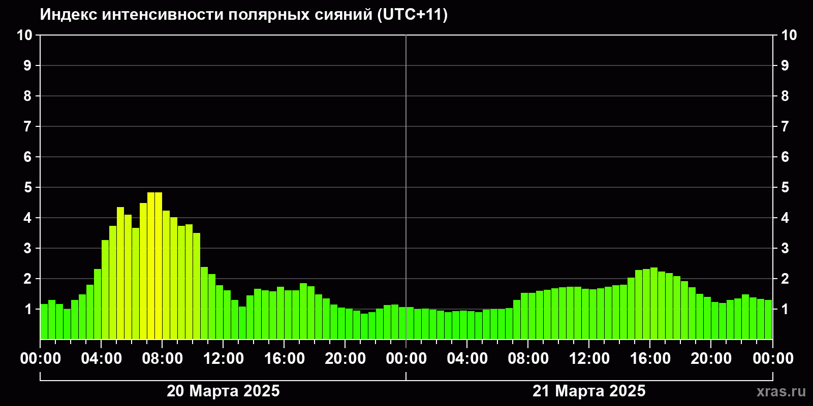 Изменения индекса интенсивности полярных сияний с 2025-03-20 по 2025-03-21 по местному времени
