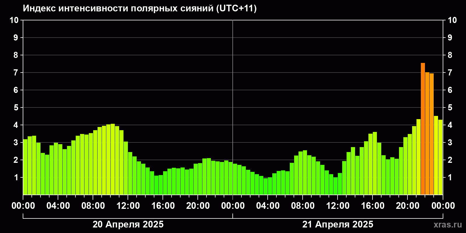 Изменения индекса интенсивности полярных сияний с 2025-04-20 по 2025-04-21 по местному времени