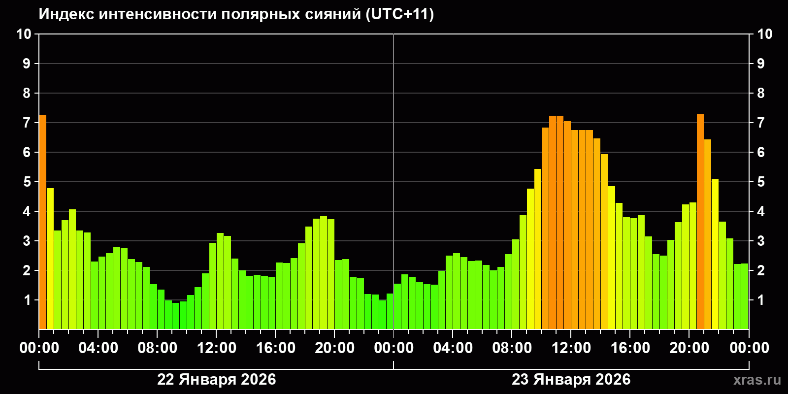 Изменения индекса интенсивности полярных сияний с 2026-01-22 по 2026-01-23 по местному времени