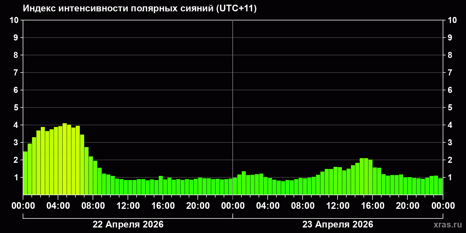 Изменения индекса интенсивности полярных сияний с 2026-04-22 по 2026-04-23 по местному времени