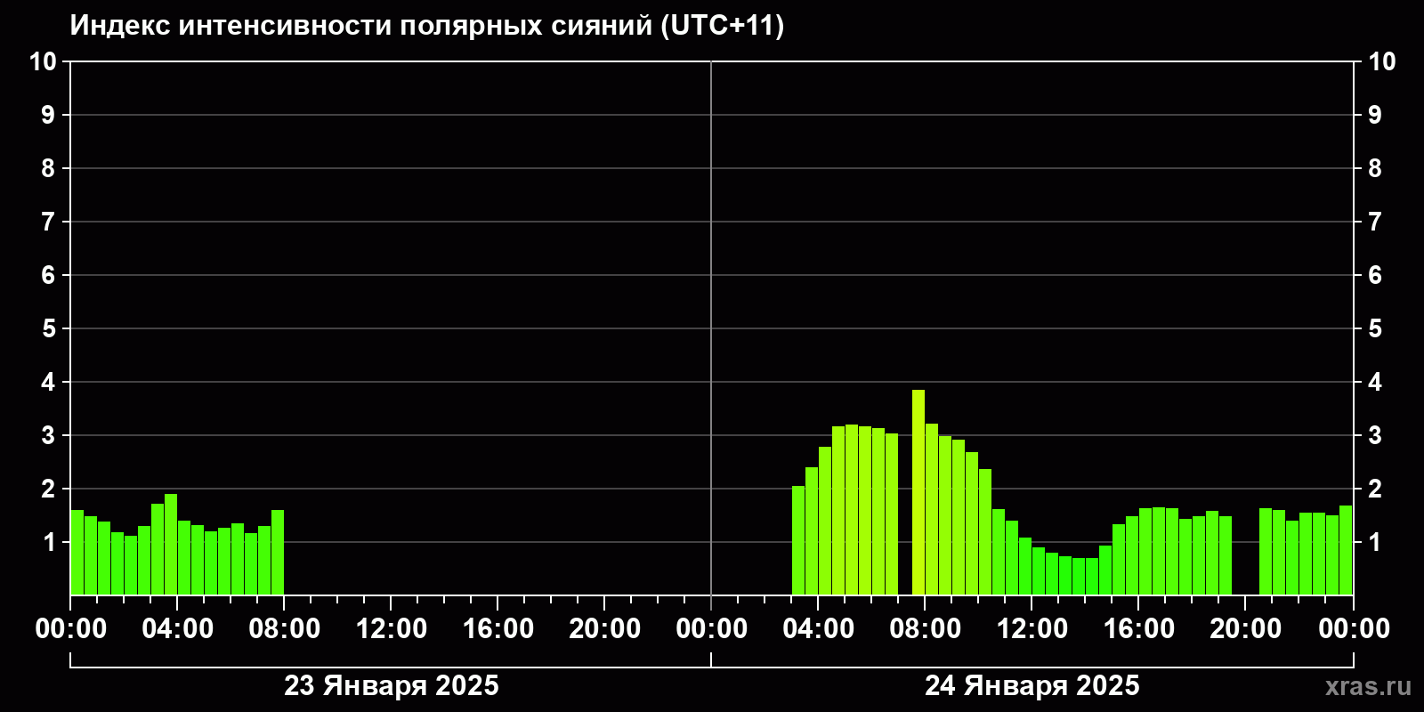 Изменения индекса интенсивности полярных сияний с 2025-01-23 по 2025-01-24 по местному времени