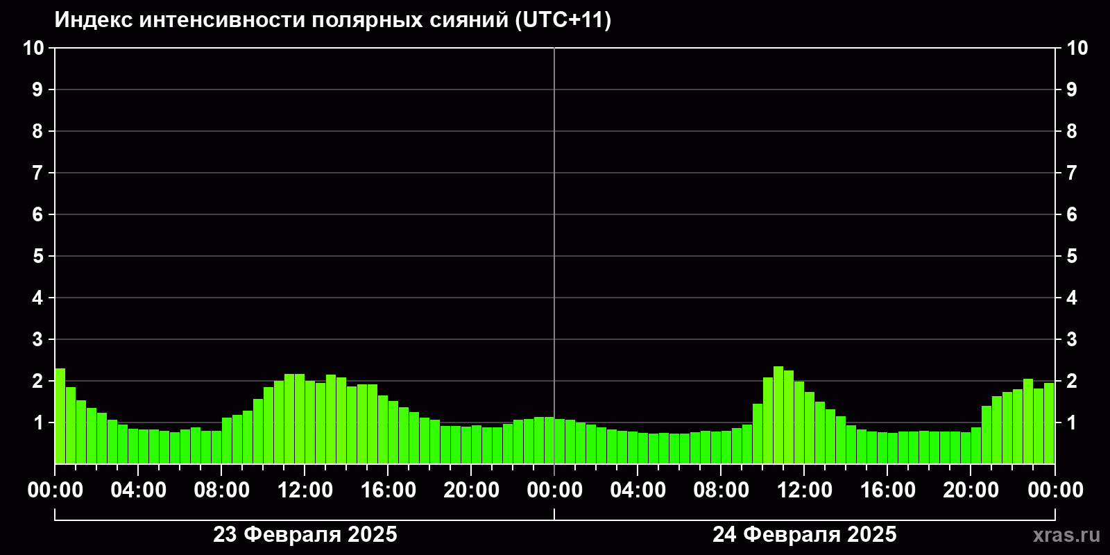 Изменения индекса интенсивности полярных сияний с 2025-02-23 по 2025-02-24 по местному времени