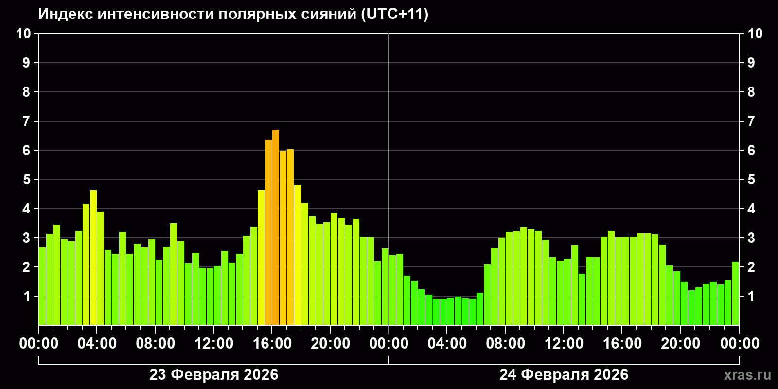 Изменения индекса интенсивности полярных сияний с 2026-02-23 по 2026-02-24 по местному времени