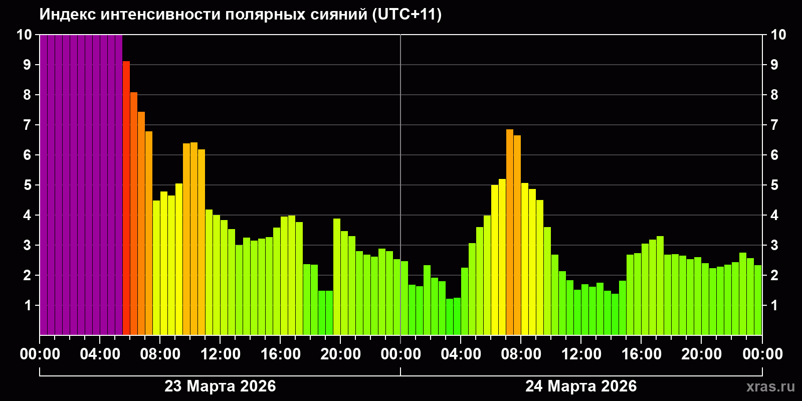 Изменения индекса интенсивности полярных сияний с 2026-03-23 по 2026-03-24 по местному времени