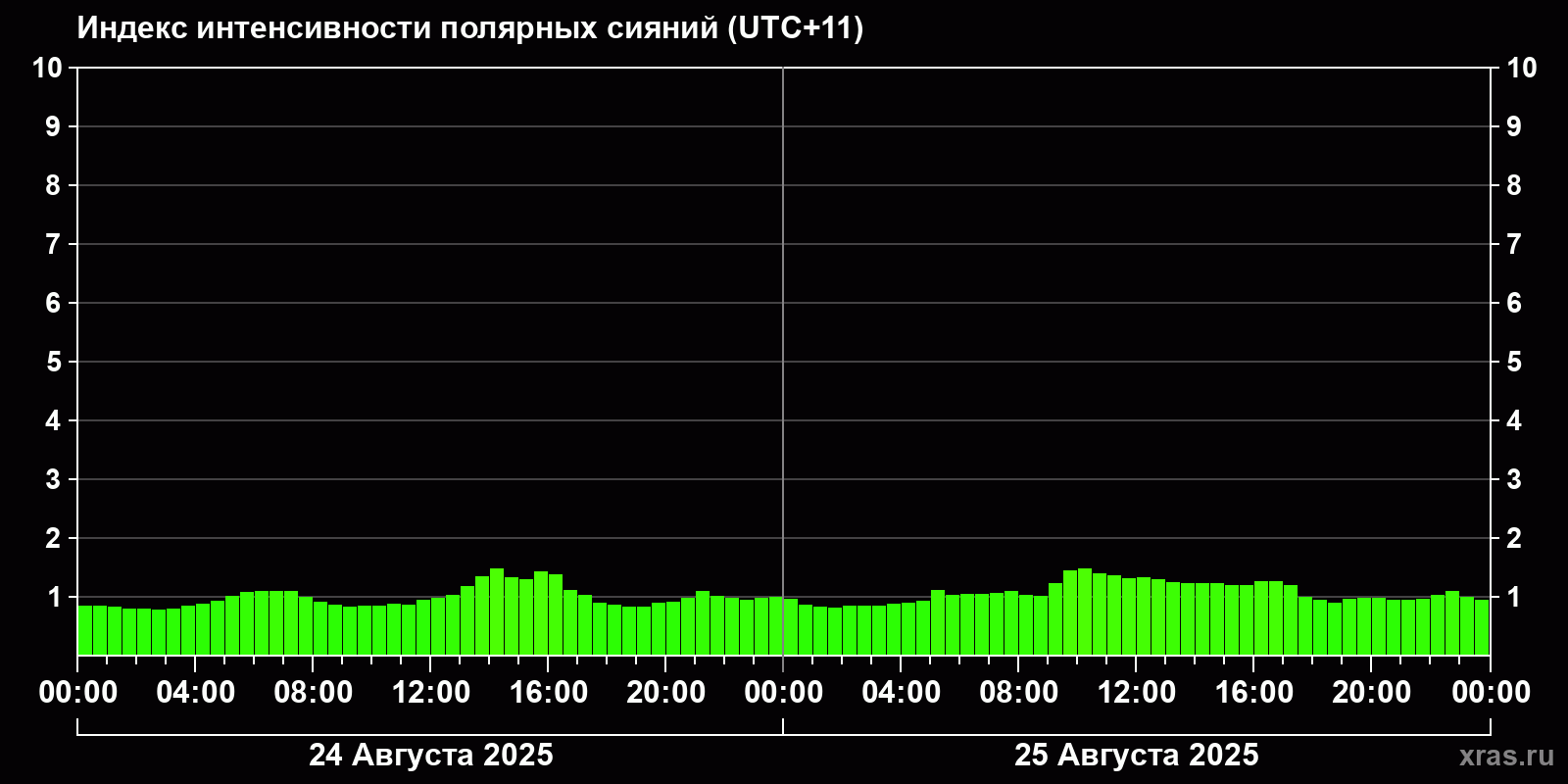 Изменения индекса интенсивности полярных сияний с 2025-08-24 по 2025-08-25 по местному времени